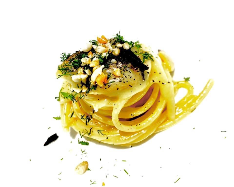Re Santi e Leoni, Spaghetto alle vongole, finocchietto, pinoli e aglio nero.