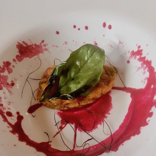 La parmigiana di “Borragine” e rapa rossa si commenta da sola per i colori e la coreografia.