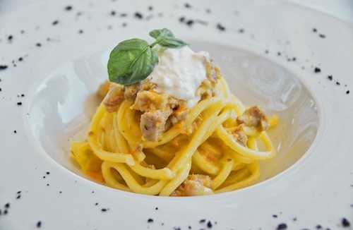 Tenuta Chianchito – Troccoli con mousse di pomodorino giallo, salsiccia, burrata e polvere di olive nere
