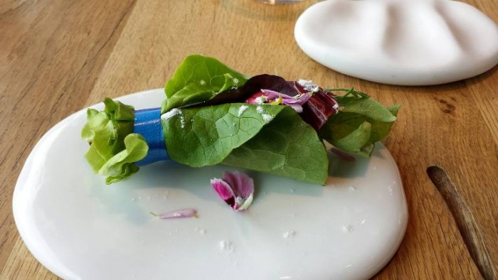 Per dessert prima una deliziosa piccola pasticceria, seguita da foie gras doppia cottura, scaloppa e ganache, salsa di fragola, confettura di fragola e cedro e fragola all’argilla bianca. Un divertissement giocoso, coreografico e sublime. Qui è stato servito l’eccellente Moscato Rosa 2014 di Franz Haas.