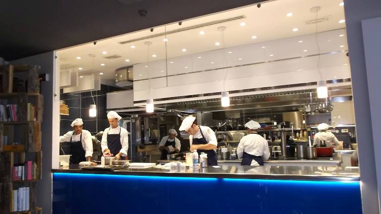 Il nuovo locale è al secondo piano dello store di Oscar Farinetti, in un ambiente ampio e luminoso che affaccia su Piazza XXV Aprile, proprio di fronte alla storica Porta Garibaldi e mostra una splendida veduta panoramica dall’alto di una grande vetrata. Una location accogliente, chic e fascinosa, arredata con gusto. Belli gli originali tavoli in massello di quercia detti briccole, lavorati artigianalmente dopo il recupero dei caratteristici pali della laguna di Venezia che segnalano le vie d’acqua ai natanti.