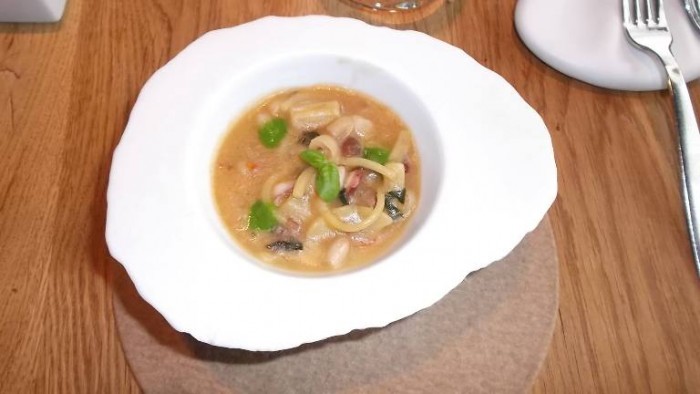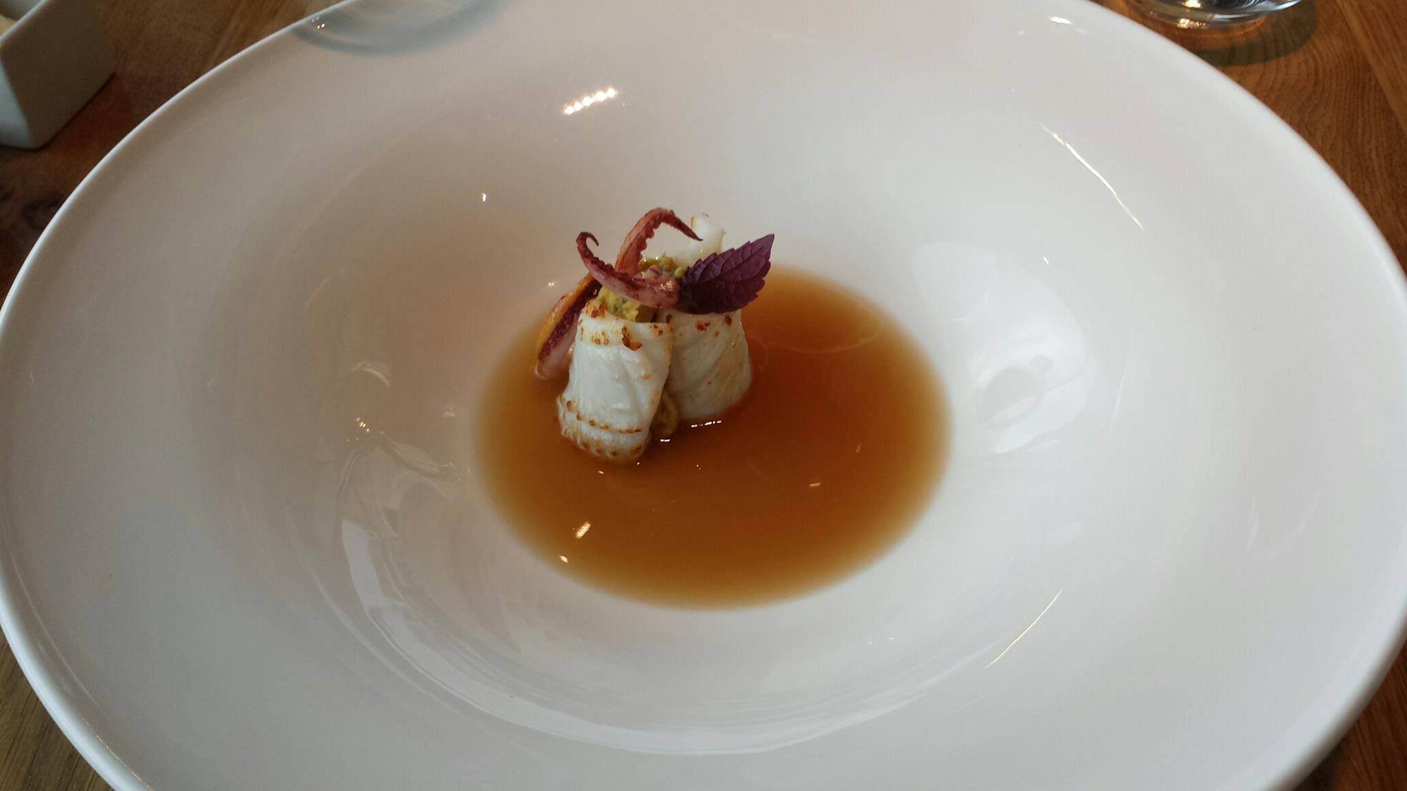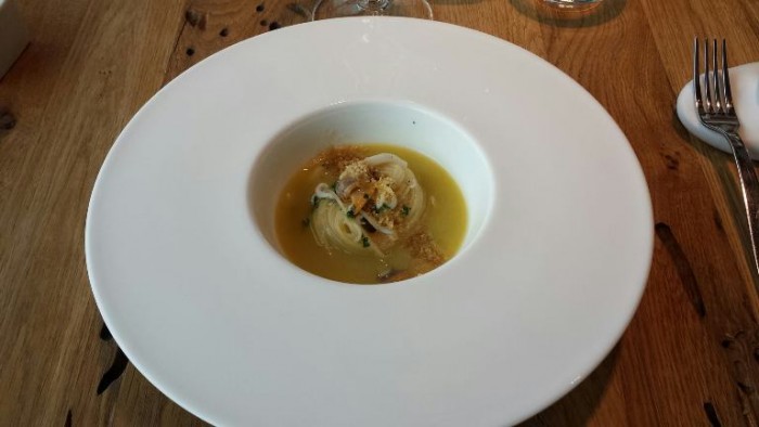Alice Ristorante, crema di ceci al curry, olio all’estratto di rosmarino, brodo di calamari e calamaro scottato
