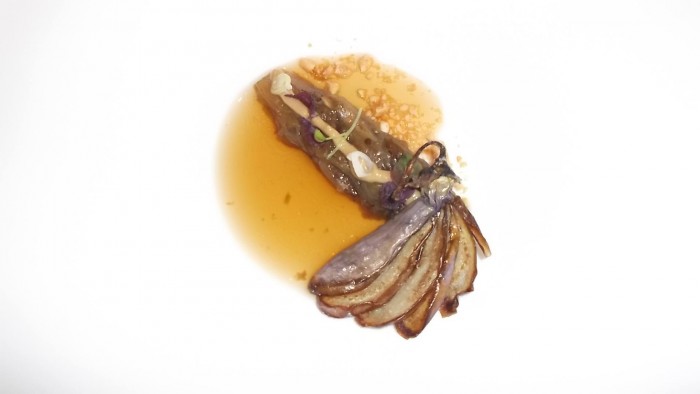 Alice Ristorante. melanzana arrostita con crema di arachidi, brodo di melanzana affumicata, melanzana fritta ed olio al sesamo e soia