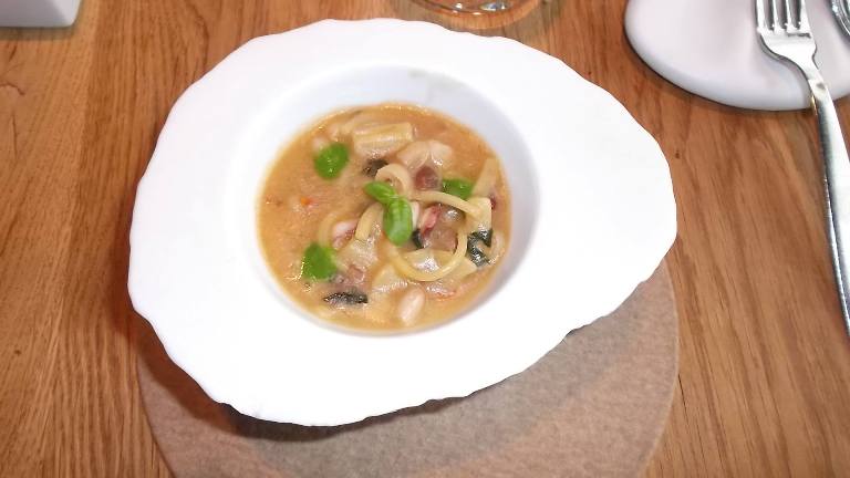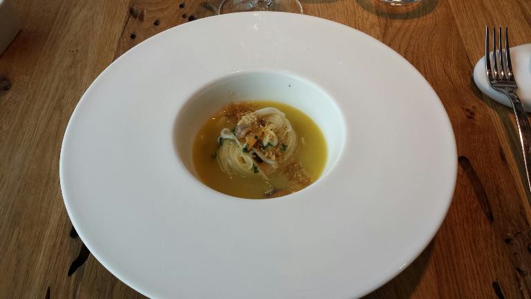 Alice Ristorante, superspaghettino con brodo affumicato, julienne di calamaro, vongole e polvere di tarallo e limone