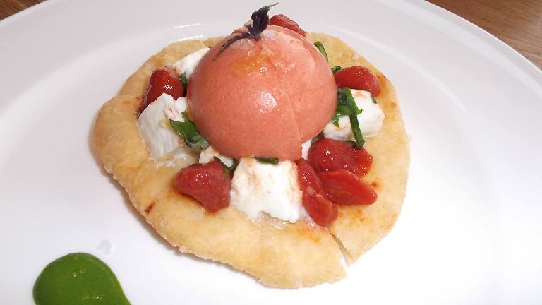 Alice Ristorante. pizza fritta con mozzarella di bufala, pomodorini confit, basilico e bavarese di pomodoro e limone