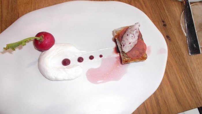 Alice Ristorante, trancio di ombrina con centrifugato di ravanello, salsa di yogurt, crema di barbabietola e lardo di cinta senese battuto