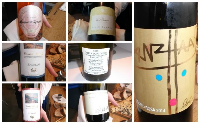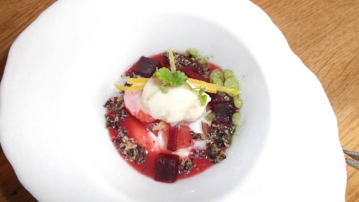 Per i secondi ottime le interpretazioni di polpo arrostito con fagiolini, taccole, patate, composta di cedro e pesto leggero, servito con il Furore Rosso Doc 2013 di Marisa Cuomo (qui avrei visto meglio un rosato o un rosso più leggero); trancio di ombrina con centrifugato di ravanello, salsa di yogurt, crema di barbabietola e lardo di cinta senese battuto, accompagnato da un eccellente Erse Etna Rosso Doc 2013 di Tenuta di Fessina.