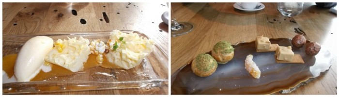 Alice Ristorante, gelato al mais, chicchi di mais affumicati, salsa e spugna di albicocca, albicocca semi candita e pop corn caramellati e piccola pasticceria