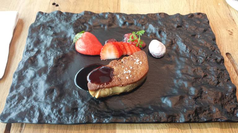 Alice Ristorante, foie gras doppia cottura, scaloppa e ganache, salsa di fragola, confettura di fragola e cedro e fragola all’argilla bianca