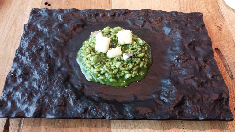 Poi un inedito risotto al placton, con brodo di seppie, seppia fritta ed aioli al latte. Piatto bene assemblato e bilanciato.