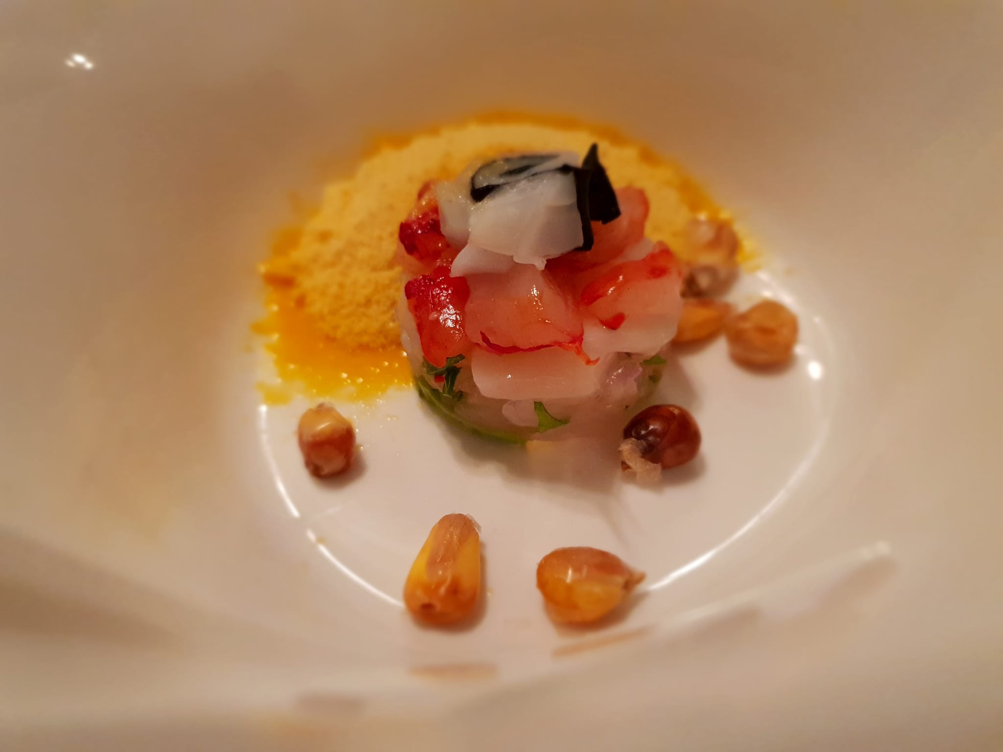 Il seconso piatto è il “Cebiche Sansei- pescados y marinados, leche de tigre al aij, amarillo nitro“. Una versione del ceviche più moderna ed elegante nel gusto, ma pur sempre mantenendo una persistenza notevole e tanto carattere.