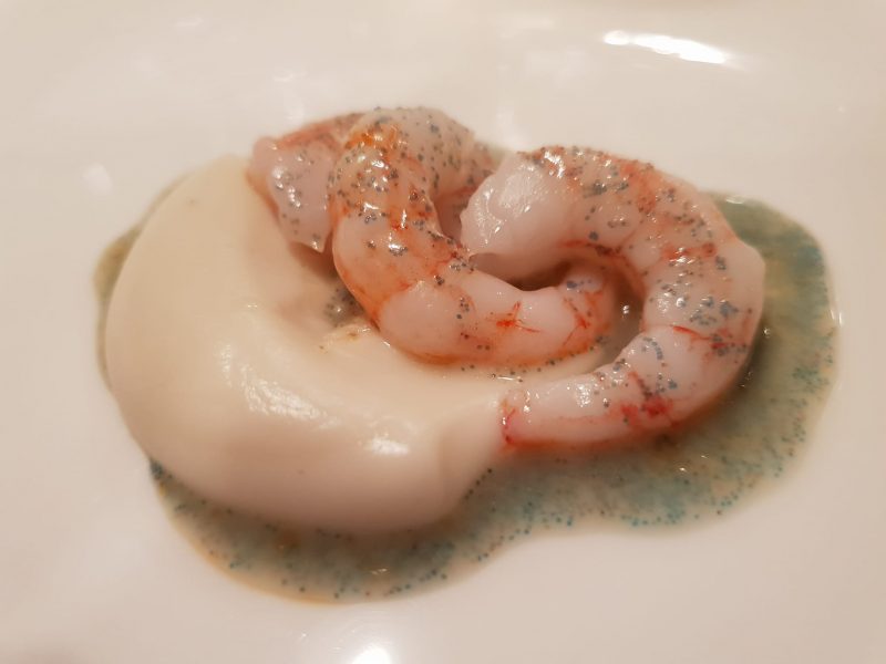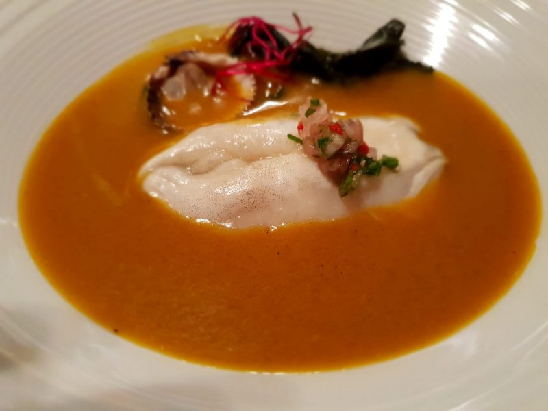 In effetti per me l’approccio con questa cucina è stato dirompente, come essere colpiti da un gancio destro di un peso massimo in pieno volto. Si parte con “Tiradito poda – crema di zarandaja, pesca del dia, aji amarillo, gel de ponzu y leche de tigre nikkei”. Un ceviche, condito con il succo del ceviche stesso, il “leche de tigre”. Violento e intenso nei sapori, spiazzante, ma veramente delizioso.