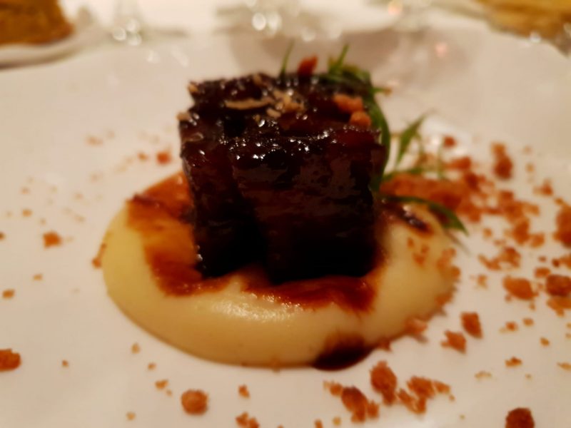 Chiudiamo la “full immersion” nella cucina Nikkei con “Asado nitsuke con pure’ de papà nativa“. La carne viene cotta per 50 ore es assume quasi uno stato gelatinoso, la consistenza è interessante, il “pure’ de papà nativa” una delle cose più buone che io abbia mai provato, lontana dall’idea “Robuchoniana” del purè di patate, ma assolutamente straordinaria e ricetta top secret.