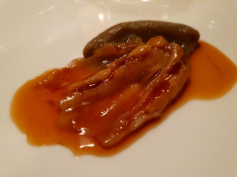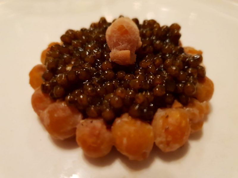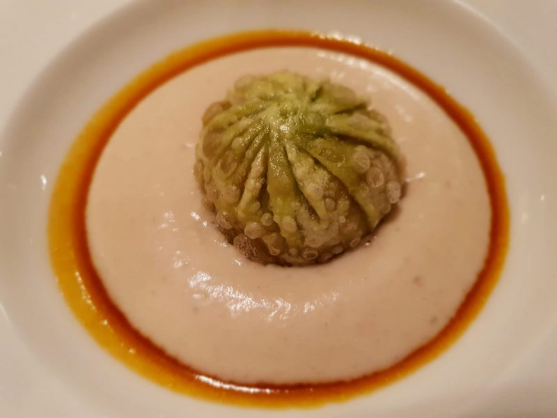 Poi è la volta del “Dim Sum de cabrito – dumpling de cabrito, espugna de frejoles, salsa de seco norteno“. Il ripieno di capretto è veramente notevole, intenso, elegante, l’abbinamento con la crema di fagioli risalta il gusto animale.