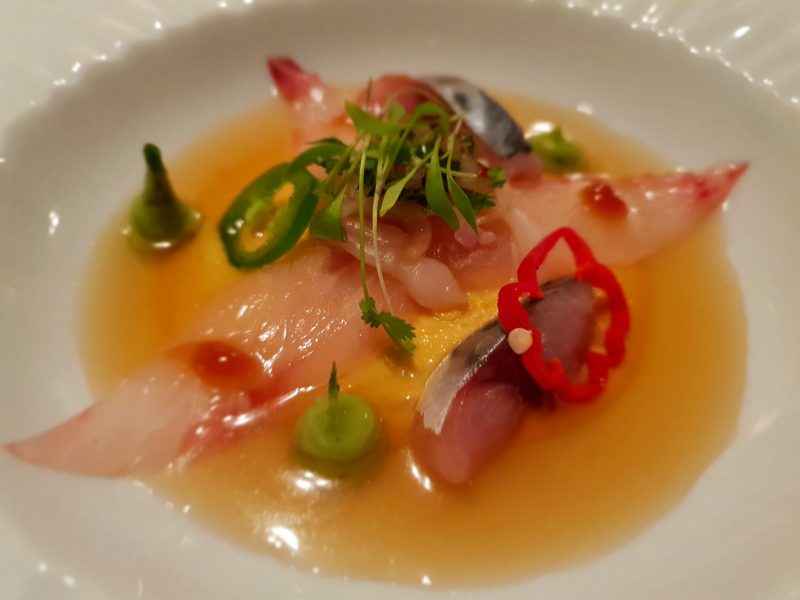 Il seconso piatto è il “Cebiche Sansei- pescados y marinados, leche de tigre al aij, amarillo nitro“. Una versione del ceviche più moderna ed elegante nel gusto, ma pur sempre mantenendo una persistenza notevole e tanto carattere.