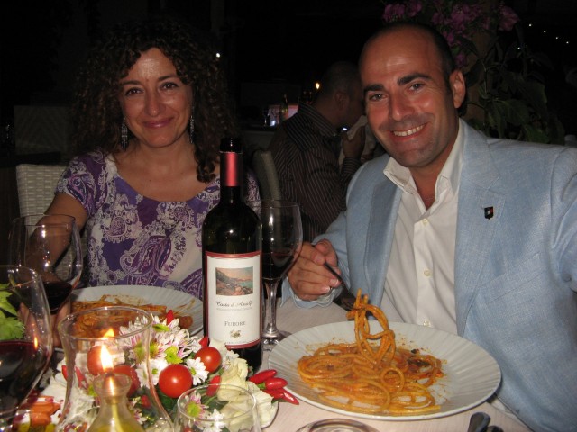 Poi i mitici bucatini all’amatriciana con delicato tocco di basilico fresco tritato ed in abbinamento il Costa d’Amalfi Furore Rosso 2010.