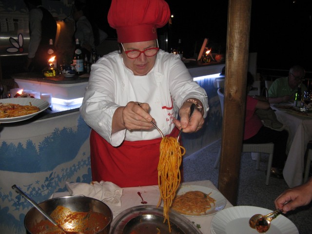 Anna è in forma smagliante, con cappellone ed occhiali rossi elargisce sorrisi senza alcuna parsimonia, chiacchiera piacevolmente con tutti raccontando la storia dei suoi piatti e piccoli aneddoti simpatici in riferimento al suo lavoro.