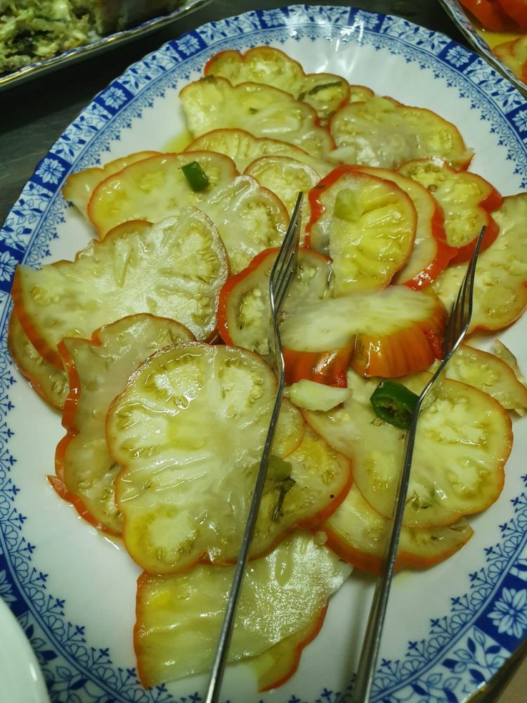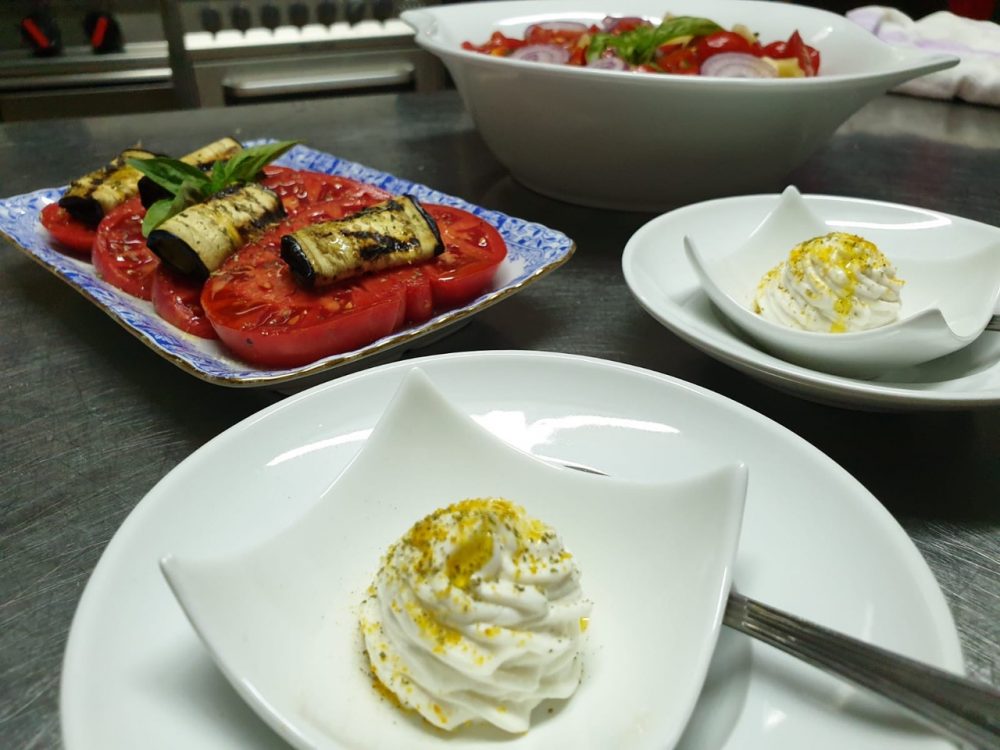E allora ecco i pomodori con melanzane grigliate condite con origano e l’olio di Mennella. E sempre pomodori con cipolle, cetrioli e basilico
