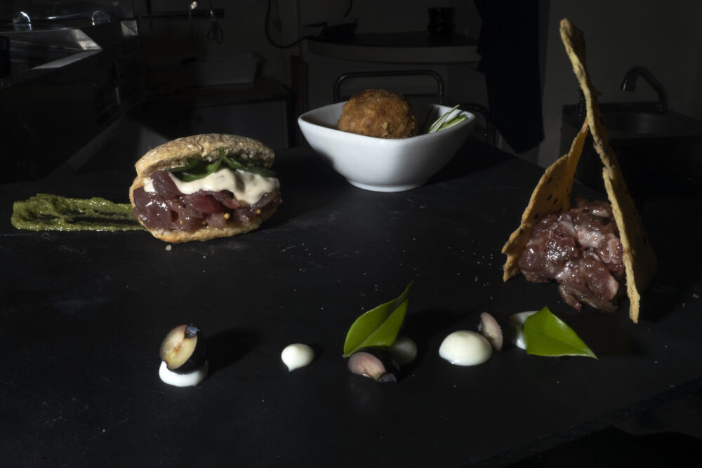 Ne il Fai da te, esordiscono anche i fegatini toscani ovviamente di agnello. Circoletto super-rosso sul Pecorino in tre Consistenze: sorta di tortino cotto al forno, con scaglie crunch e mousse di se stesso.