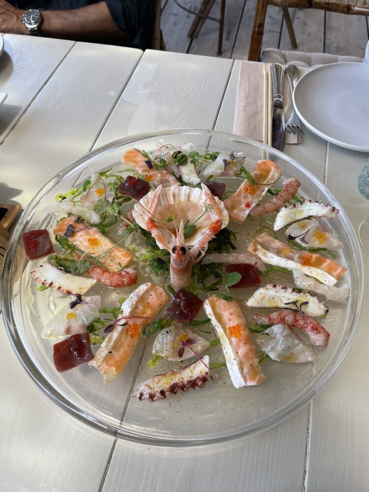 Giappo-brasiliano Ricardo Takamitsu sfodera tutta la sua abilità nel saper maneggiare i coltelli nel piatto di Carpaccio E.L. Takamitsu preparato con pesce locale e con i condimenti del Sushi mix ben calibrati tra dolce, speziato e piccante senza coprire il gusto della materia prima.