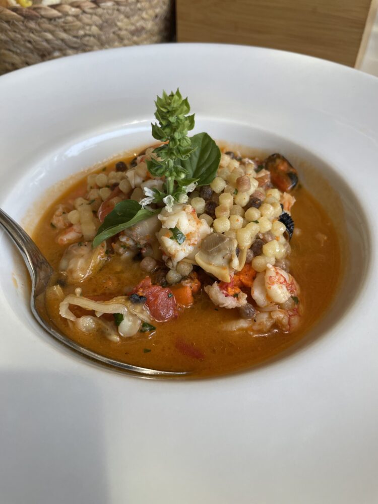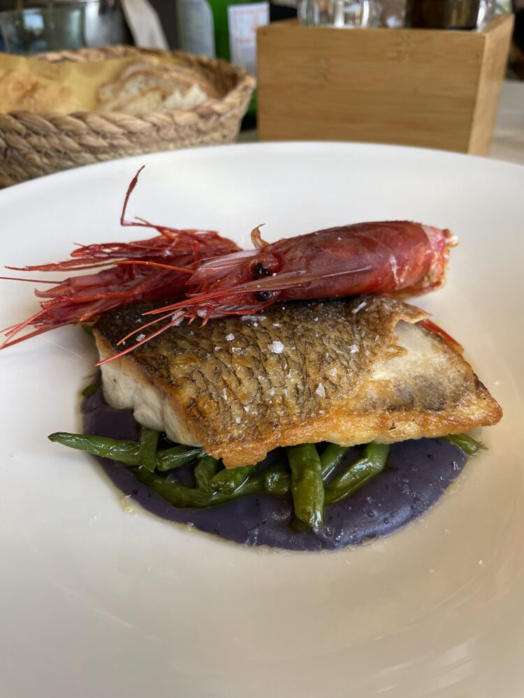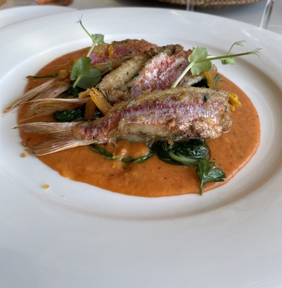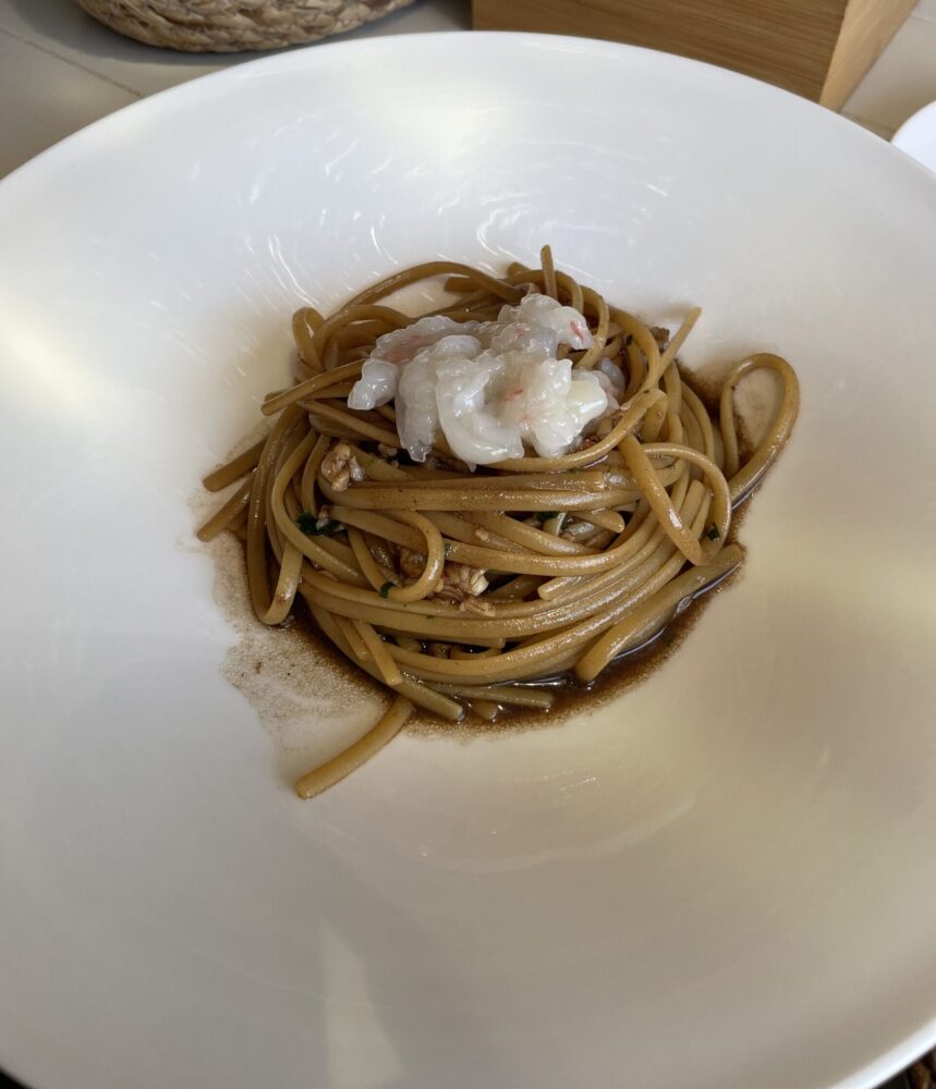 Le Linguine all’aglio nero scampi e colatura di alici sono una perfetta sintesi tra sapore mediterraneo ed echi orientali un mix molto ben riuscito. L’Ombrina e la Triglia di scoglio e pappa al pomodoro con bufala e bieta appena scottata sono quei bocconi della cucina di mare che rispecchiano la Maremma.