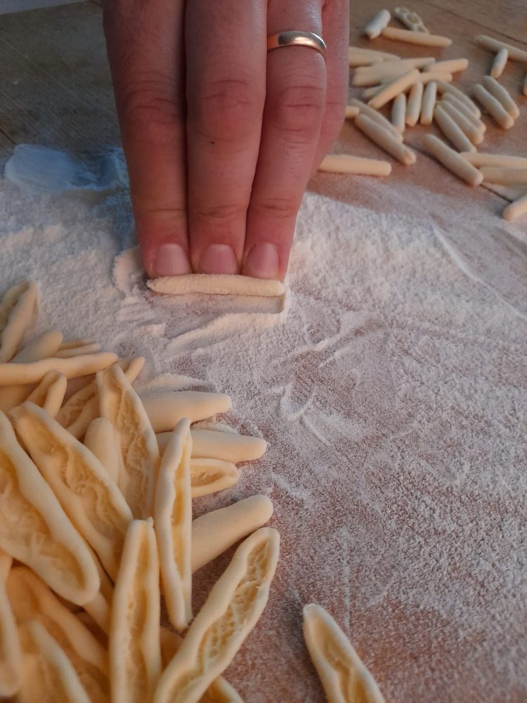 Preparare la pasta disponendo sulla spianatoia la farina con un pizzico di sale. Versarvi l’acqua e impastare fino ad raggiungere una consistenza soda ed elastica. Avvolgere in un canovaccio e lasciar riposare per almeno 30 minuti. Stendere la pasta formando dei cilindri lunghi 7/8 centimetri, cavarli con il palmo della mano e porli ad asciugare.