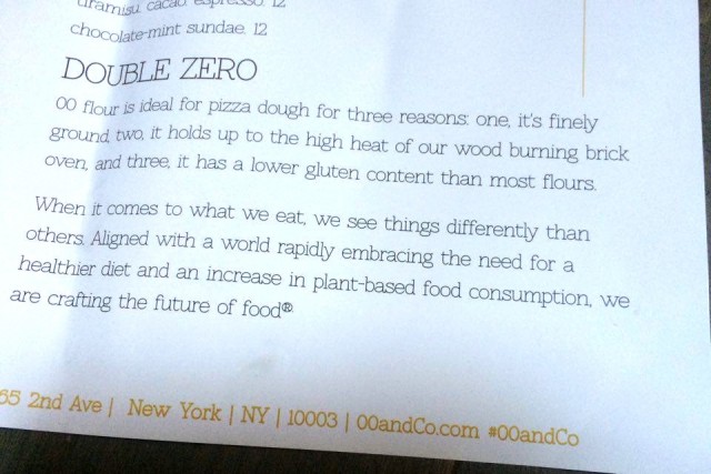 Farina 00 e integrale. Mentre il dibattito in Italia è avvitato al punto da spingere alcuni pizzaioli napoletani a rinnegare se stessi e la loro tradizione, nel disperato tentativo di coprire la loro incapacità nel lavorare la 00 ad alto livello, vai a East Village nel cuore di New York per scoprire che tre mesi fa il guru veano crudista Matthew Kenney ha aperto una pizzeria vegana chiamandola 00 più Co.