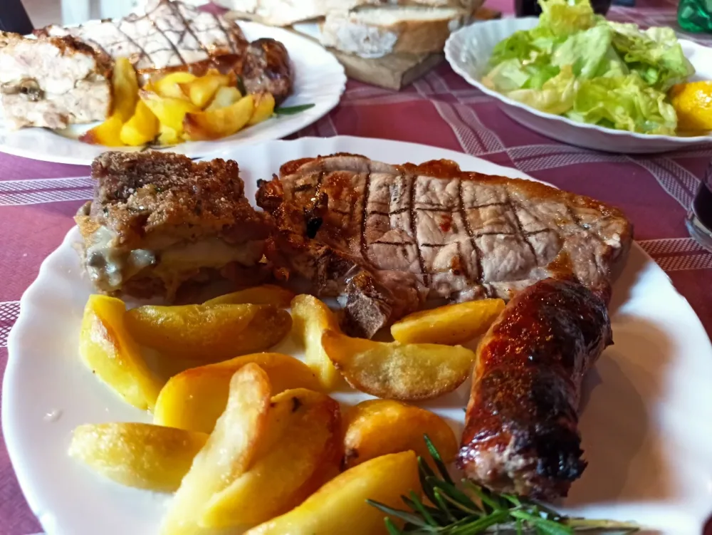 Stessa situazione per i secondi proposti, si va di assaggio anche qui: -Polpettone di Salsiccia locale con funghi e provola matesina; -Salsiccia al finocchietto arrostita e una tenerissima e succosa costoletta di maiale arrostita. Per contorno insalata e Patate cotte nel proprio forno a legna.