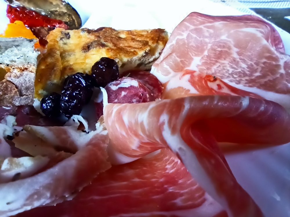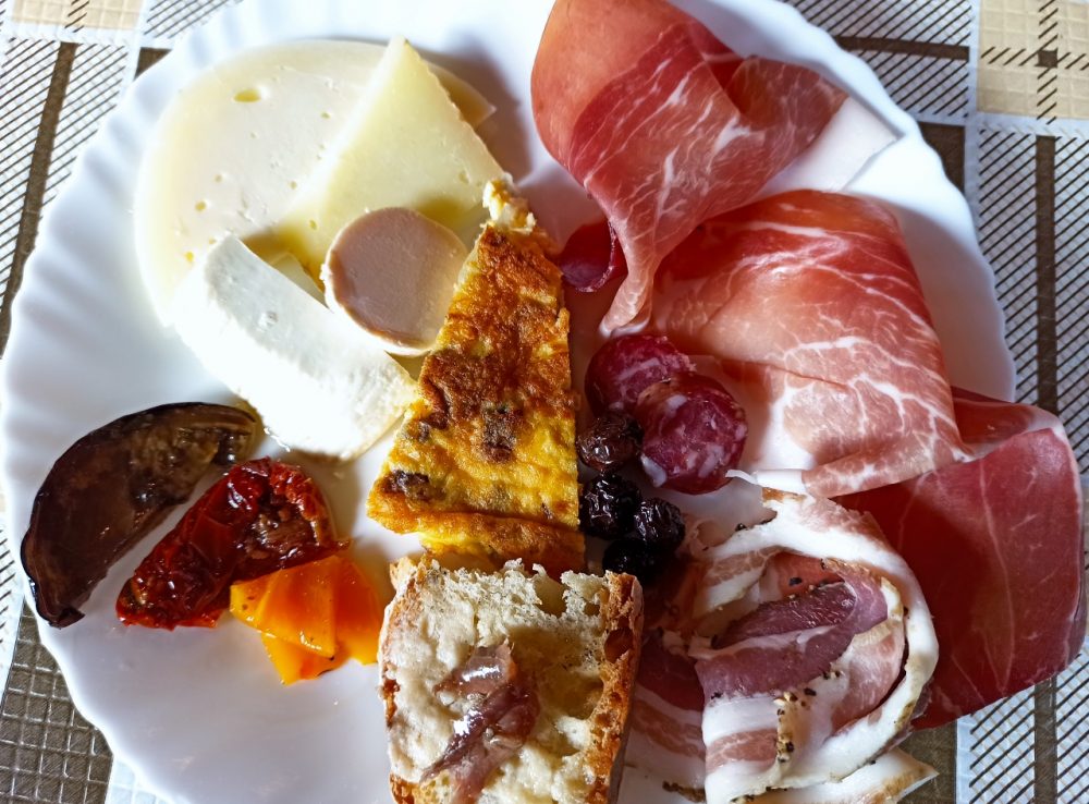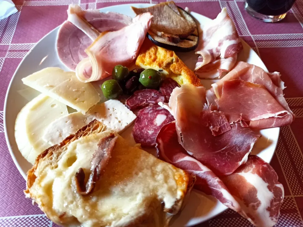 L’Antipasto è composto da: un dolcissimo prosciutto crudo di Pietravairano; una ultra-artigianale ventresca e salsiccia secca di produzione locale; quattro assaggi di caratteristici e gustosi formaggi (Caciocavallo e Primo Sale locali; Caciotta del Matese e Filoncino del Matese a cui viene fatto passare una notte sotto terra in una cassetta di legno, prima di essere insaporito a piacere con olio e spezie varie, peperoncino nel nostro caso); Bruschetta con acciughina su una intensa e piccantina crema di Pecorino del Matese ottenuta tramite uno speciale procedimento); qualche ortaggio sott’olio ottenuto dalle proprie olive; olive proposte anche nella saporita versione al forno; imperdibile frittata con cipolle di Alife e tegamino di Trippa e Fagioli con un sughetto che invita alla scarpetta fino all’ultima goccia.
