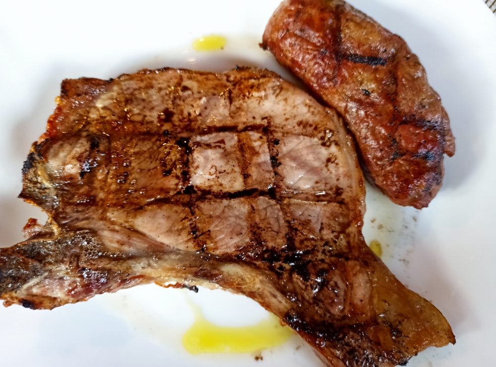 Assaggiamo logicamente anche l’altra proposta rappresentata da una morbidissima costoletta di maiale al Greco di Tufo e una bella salsiccia paesana, di quelle con il sapore che ti rimandano indietro nel tempo, quando l’artigianalità era più la regola che l’eccezione.