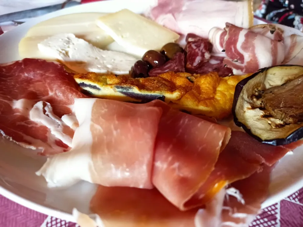 Viene poi servito un antipasto al piatto a persona contenente: -Prosciutto crudo di Pietravairano; -Capocollo, Pancetta, Salsiccia secca e Soppressata locali; Porchetta del basso Lazio; -Bruschetta con Caciocavallo impiccato e acciuga; -Melanzana arrosto e pezzetto di porchetta; -Olive Caiazzane; -Formaggi del Matese e l’immancabile -Frittata di Cipolle di Alife, tutto accompagnato dall’ottimo Vino naturale della Casa.