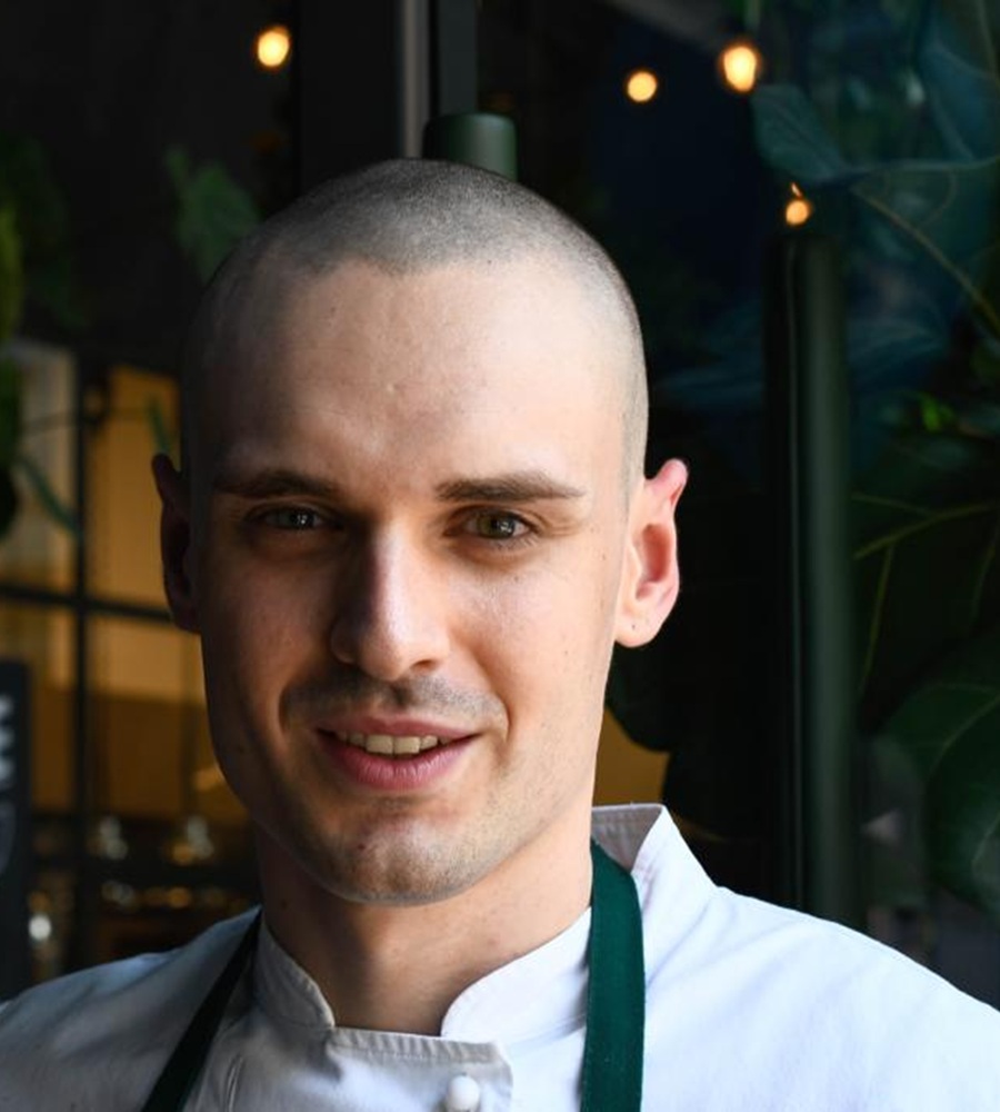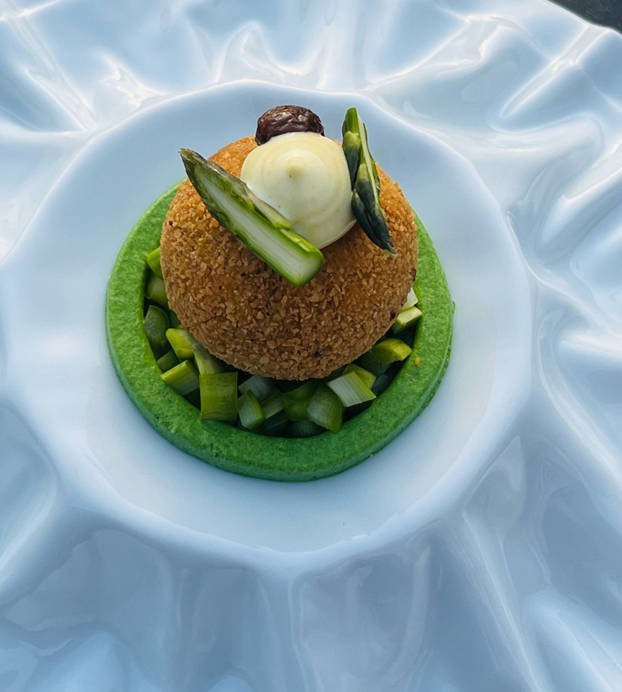 Posizionare l’arancino sull’insalatina di asparagi e decorare con un ciuffo di maionese all’aceto di Kombucha. Ultimare decorando con l’uva sultanina macerata in aceto di Kombucha ed un paio di punte di asparagi lattofermentati.