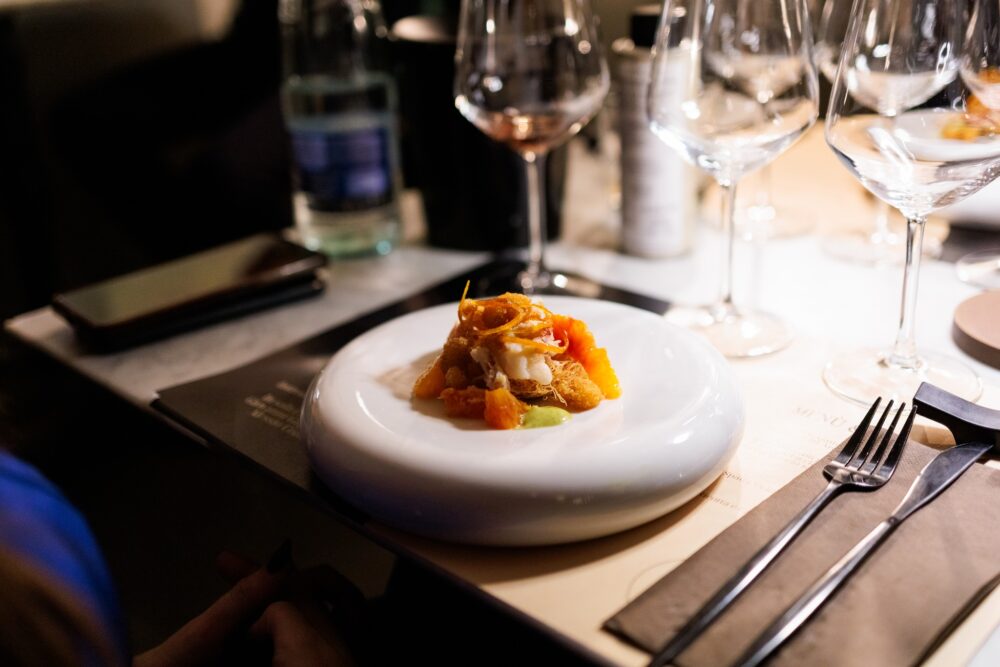 Il percorso è stato composto da diverse portate, nelle quali i prodotti ittici sono stati sempre protagonisti: partendo dai crostacei, passando per seppie e ricci, fino ad arrivare al pesce spada e al baccalà. I quattro vini abbinati alla serata hanno dunque affrontato l’arduo compito di dimostrare che anche le bollicine del Franciacorta, e persino i suoi vini fermi, possono sposarsi felicemente con una cucina che guarda al mare.