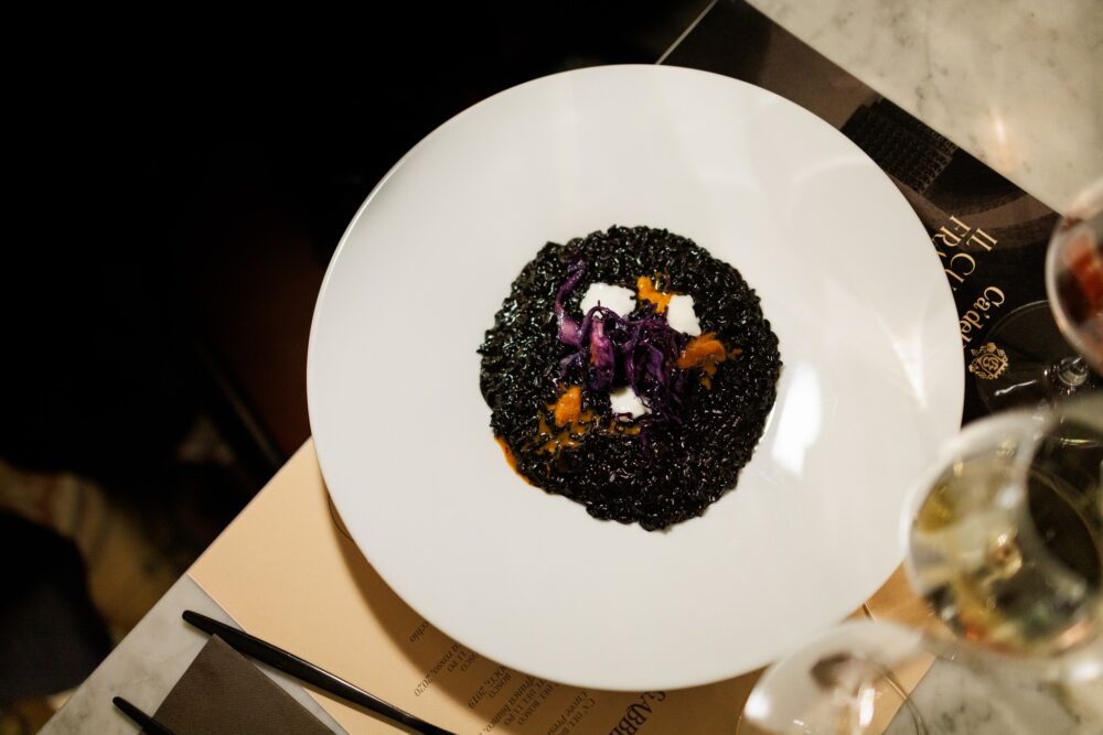Come primo piatto, invece, è stato proposto un riso nero (con presenza anche di nero di seppia) con polpa di ricci, stracciatella e cavolo cappuccio saltato. Di fronte a questa portata è stato interessante provare due vini differenti e analizzarne il comportamento sul medesimo boccone. A “sfidarsi” sono stati il Corte del Lupo Curtefranca Bianco 2021 e il Satèn DOCG 2019 di Ca’ del Bosco.