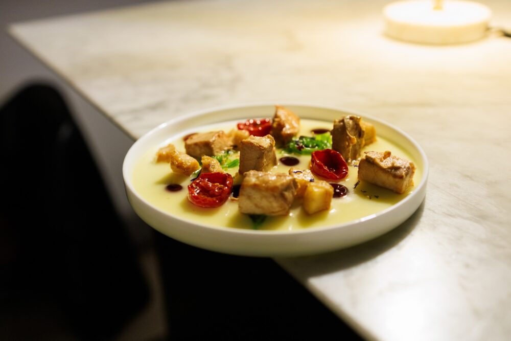 Contrariamente a ogni aspettativa — o forse sarebbe meglio dire, a ogni credenza — l’accoppiata che ha funzionato meglio è stata quella tra “Spada VS Baccalà” e il Corte del Lupo Curtefranca Rosso 2020. Il piatto era composto da una crema di patate, pesce spada e baccalà cotti delicatamente, così da preservarne la morbidezza, pomodorini confit e riduzione di soia. Una portata di spessore, piacevole e avvolgente.Nel calice, il taglio bordolese di Ca’ del Bosco, che comprendeva anche un 3% di Carmenère, ha regalato piacevoli profumi di peperone verde e sentori terziari, dovuti all’invecchiamento di 12 mesi in barrique di rovere. Il tannino del vino rosso asciugava la bocca dalla salivazione indotta dalla tendenza grassa del piatto, creando una ciclicità di sapori totalmente inaspettata e confermando, ancora una volta, che pesce e vino rosso possono perfettamente coesistere.