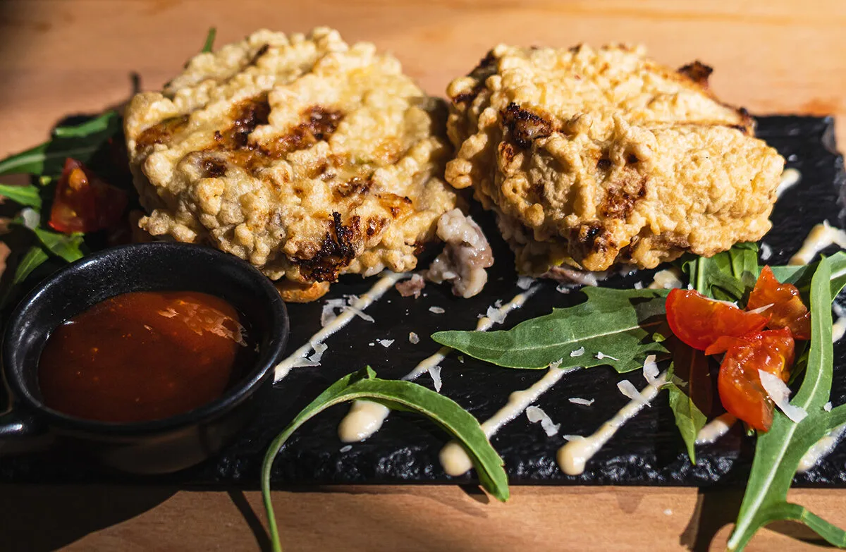Questa ricetta è nata dalla voglia di realizzare una preparazione diversa dalle altre, da utilizzare come tratto distintivo del locale. Tra piatti troppo complessi per un pub, o troppo semplici, si è deciso di evidenziare quegli elementi che fanno di un pub, un buon pub: carne e birra di prima qualità. Dunque, alla frittatina, oltre alla chianina, è stata aggiunta la birra rossa del Brenta, che conferisce alla preparazione quel gusto prepotente e intenso che mancava. In abbinamento una Fravort IPA, frizzante, dal gusto floreale e fruttato, con note acide che aiutano a ripulire il palato.