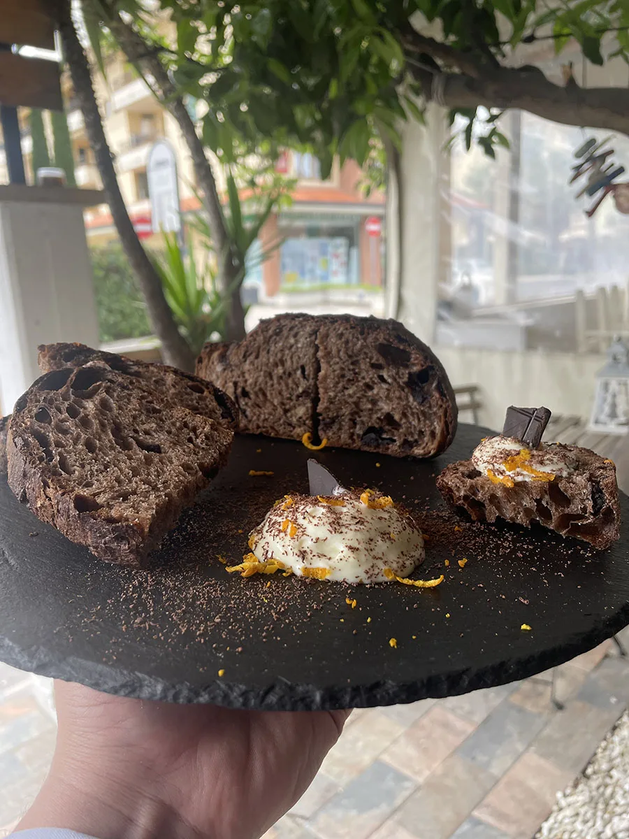 Realizzare l’autolisi unendo insieme la farina di tipo 1 ed il 65% dell’acqua. Lasciar riposare per 3 ore a temperatura ambiente. Nel frattempo, preparare il poolish unendo insieme la farina aria, l’estratto di arance, lo 0,7 % di lievito, lasciando maturare per 8 ore. In impastatrice, unire insieme l’autolisi, il poolish e il cacao e lasciar impastare in prima velocità fino all’ottenimento di una buona maglia glutinica. Aggiungere l’olio e lasciar assorbire. Passare in seconda velocità ed inserire la restante acqua e il sale. Infine, aggiungere tutti gli inserti e lasciar impastare per ulteriori 2 minuti. Far riposare l’impasto per 15 minuti all’interno dell’impastatrice, per poi trasferirlo sul banco da lavoro, lasciandolo riposare per ulteriori 10 minuti. Trasferire in un mastello e poi in frigorifero per 20 ore. Tirare fuori dal frigo l’impasto e aspettare che quest’ultimo ritorni a temperatura ambiente. Formare le pagnotte, trasferirle nei cestini di lievitazione e lasciar lievitare per 4 ore a 24 °C. Infornare per 45 minuti a 250 °C.