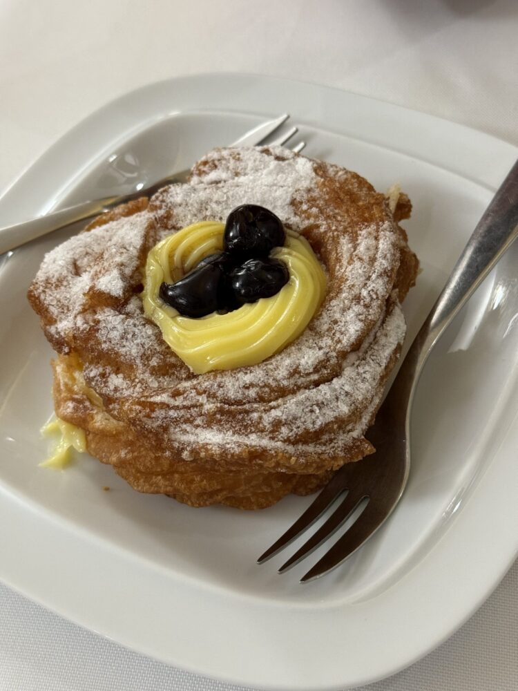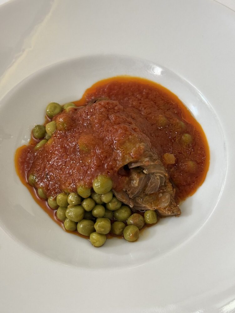 Per secondo, abbiamo scelto la braciola di vitello, cotta nella stessa salsa delle cannazze, servita con piselli. Un piatto che riporta alle tavole della domenica, dove il tempo ha ancora valore e il cibo racconta storie. E per concludere, una zeppola fritta della casa, semplice e golosa, perfetta con il caffè.