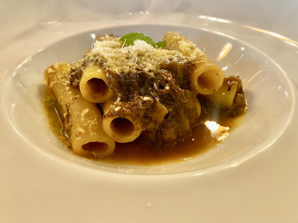 Anche sulla pasta sfatiamo un mito. Certo l’abbinamento storico è con lo zito spezzato a mano, ma la perfezione non è di questo mondo e per un risultato più che dignitoso, si può tranquillamente ripiegare su una qualsiasi pasta corta, cilindrica e forata, l’importante è che sia rigorosamente liscia, trafilata al bronzo essiccata lentamente a bassa temperatura, per assicurarsi la giusta porosità e ruvidità.