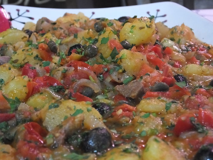 Tagliare le cipolle e i peperoni a listarelle e farle appassire in un’ampia padella in olio extravergine di oliva. Come cominciano ad appassire aggiungere capperi, olive, i pomodori tagliati in quattro e il vino bianco.