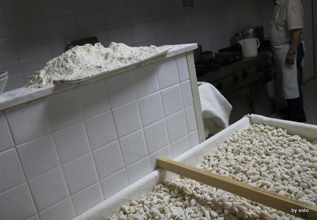Non c’è più zia Irene, ma altre mani di donna, più giovani si fanno avanti per continuare la tradizione. Si leva la farina dal sacco, il candido e soffice sciore doppio zero, e lo si cala a fontana sul grande tavolo da lavoro. Si scava e s’impasta con l’acqua bollente, tanto bollente da scottare le mani maldestre, e un pizzico di sale. E poi ad uno ad uno si staccano gnocchi e s’incavano con le dita. Distese infinite, chili su chili lasciati lì per essere venduti ogni giorno, tutte le settimane dell’anno.