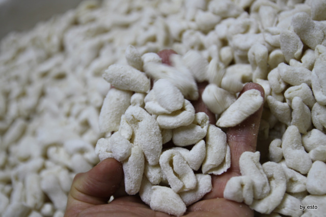 E sempre in allegria, aspettando che il tempo accompagni la cottura. Gli gnocchi, che qualcuno da queste parti chiama strangolapreti e qualcun altro cazzamarri, hanno bisogno sì e no di qualche minuto per venire a galla ed essere scolati dall’acqua bollente. Si cuociono presto e subito si rimescolano nella zuppiera.