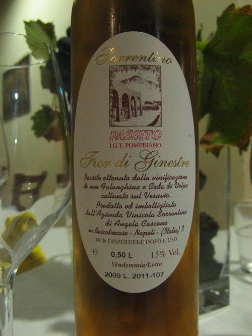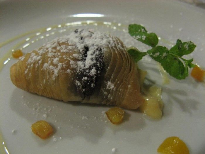 – Dessert: sfogliatella con scorzetta di arancia al cioccolato con crema allo Strega e uva fresca di Carmine con Passito Fior di Ginestre