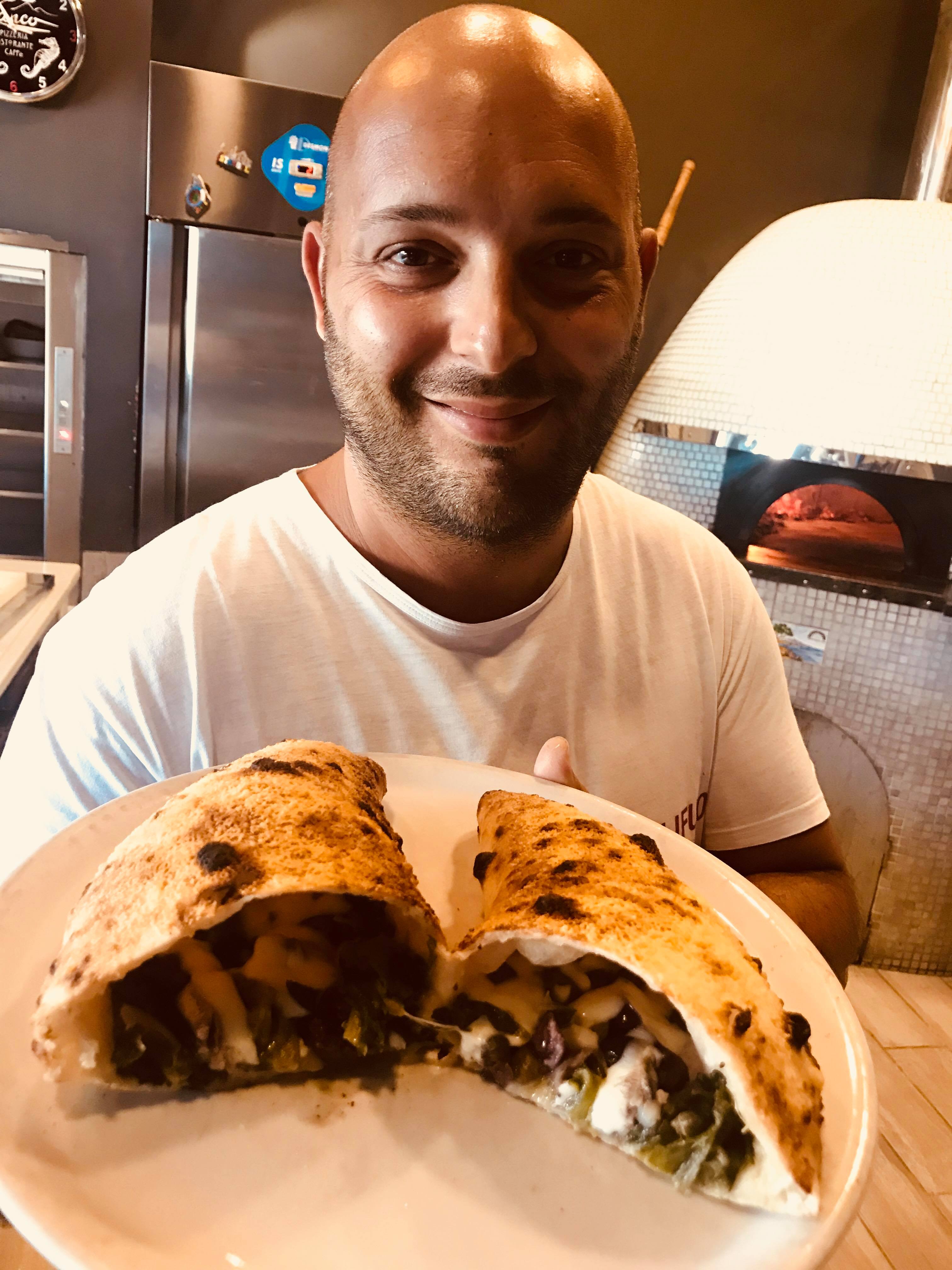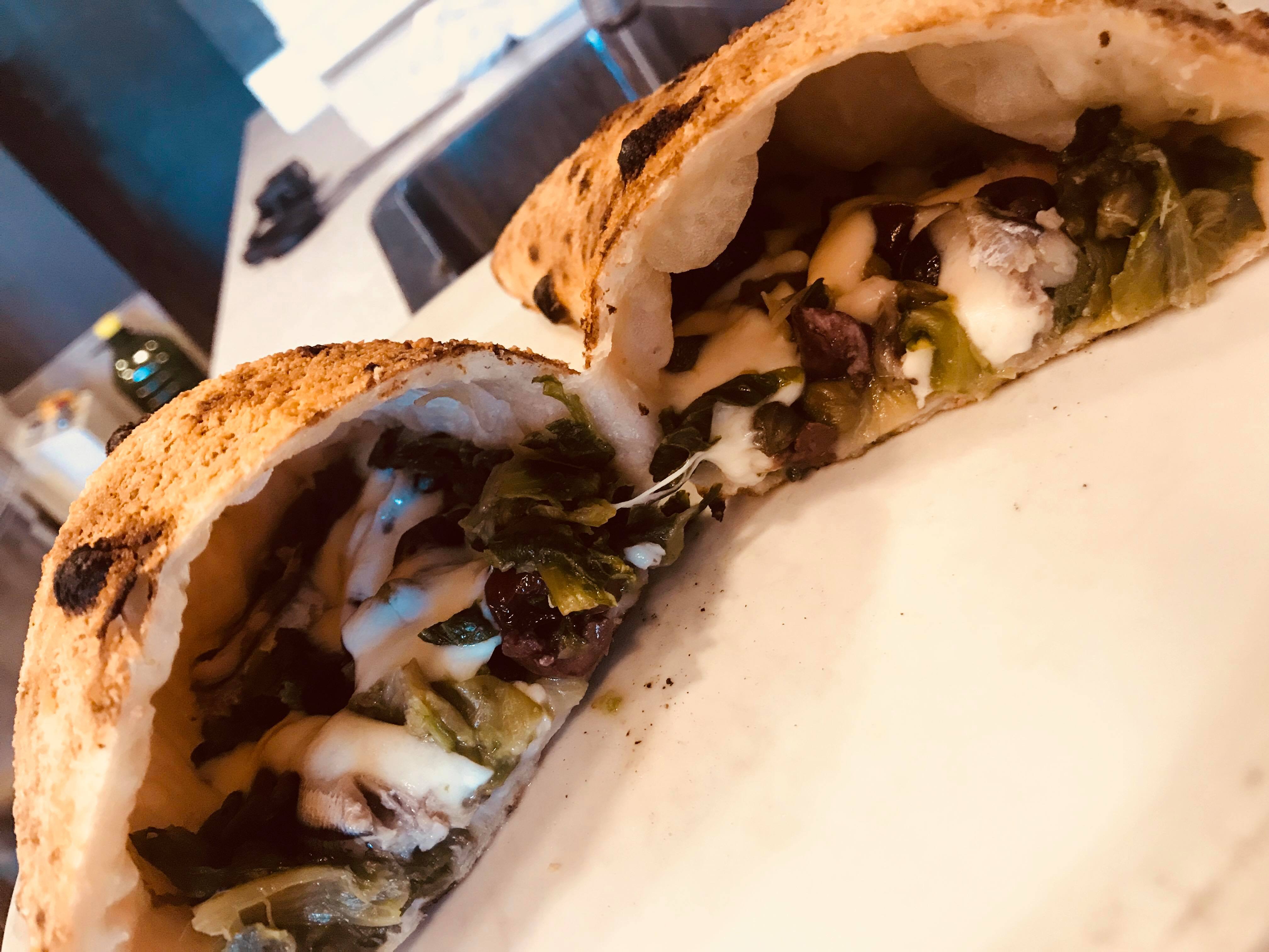 In pratica una sorta di panino con l’impasto della pizza napoletana, idratato in questo caso al 65%. Il successo è stato immediato. In pratica dentro ci si può mettere di tutto e il prezzo varia tra i 6 e gli 8 euro (come questo con le alici, la scarola, le olive e il fiordilatte).