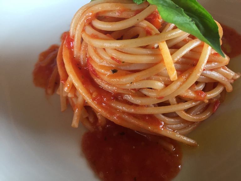 Lo spaghetto al pomodoro è reso più intenso dal trucchetto dei pomodori infornati.
