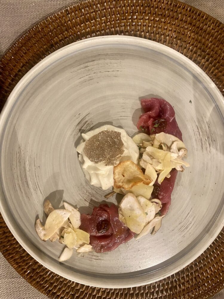 Manzo marinato all’olio e al mosto cotto, dall’insalata di funghi porcini, spuma di topinambur e tartufo – Locanda della Luna