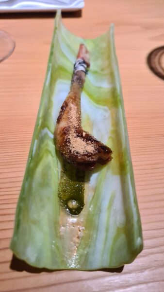 Inaspettatamente strepitose, un incipit bruciante, sono le erbe bruciate con salsa di ricci di mare e umeboshi, ed è qui che si vede la classe infinita di questo eterno ragazzo marchigiano: un soffio di gusto attraverso sottilissime sfoglie croccanti che profumano di mare nella sua purezza. Questa è, sì, Essenza! Che fa pendant con le spine e con l’anima che è il leit motiv del percorso.
