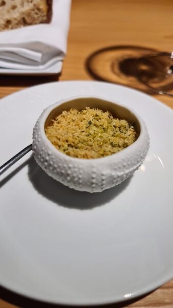 Il riccio di mare è un classico di Cedroni, che con coloriture esotiche e la nota dolce amplifica il salmastro. Davvero notevole.