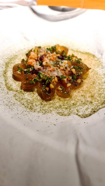 Infatti, se l’ostrica alla griglia, pepe di Aleppo (appunto) e cavolo viola è un altro modo di rivedere la classica “ricordo di un viaggio in Vietnam”, già l’incipit con il cracker di moeca (ebbene sì, nella cialda c’è una vera moeca, non è un banale trompel’oeil) e lo spriz rigorosamente al Select centra il cuore della Venezia contemporanea (che in verità non esiste !), e anticipa un highlight assoluto del percorso, la crema cotta ai ricci di mare, tahina, umeboshi e datteri, dedicata a Baghdad.