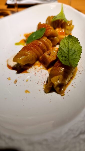 Fusilloro Verrigni al burro di erbe, trippa di coda di rospo, salsa di mandorle e parmigiano, crescione e nasturzio: pasta al dente, abbinamento goloso, intermezzo tra la prima parte della cena e il secondo.